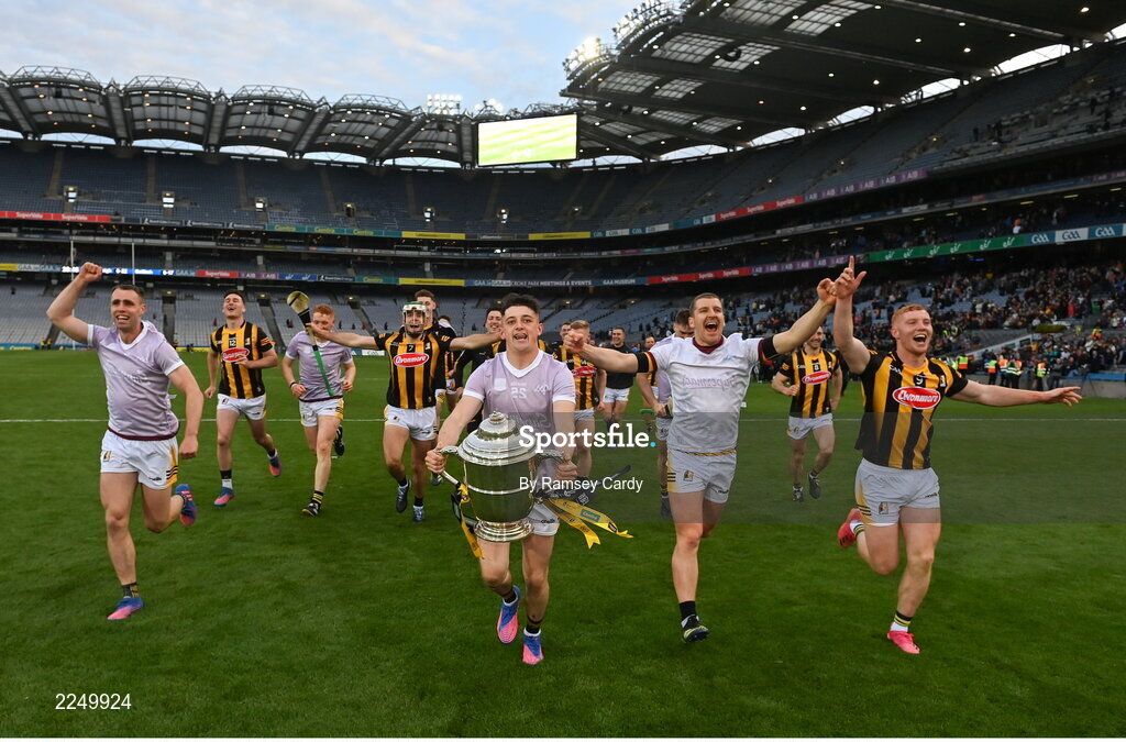4 June 2022; Kilkenny players including Cian Kenny, Eoin Murphy and Adrian Mullen celebrate with the Bob O'Keeffe cup after the Leinster GAA Hurling Senior Championship Final match between Galway and Kilkenny at Croke Park in Dublin. Photo by Ramsey Cardy/Sportsfile