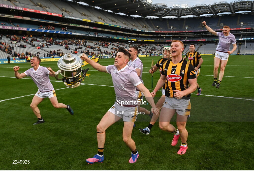 4 June 2022; Cian Kenny, left, and Adrian Mullen of Kilkenny celebrates with the Bob O'Keeffe cup after the Leinster GAA Hurling Senior Championship Final match between Galway and Kilkenny at Croke Park in Dublin. Photo by Ramsey Cardy/Sportsfile