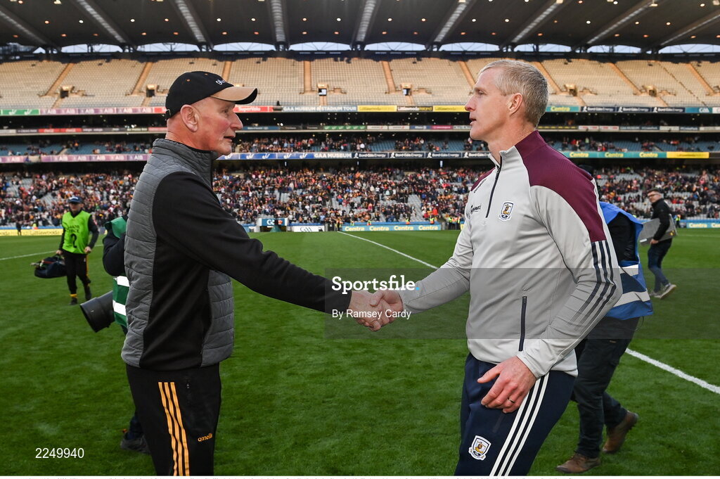 4 June 2022; Kilkenny manager Brian Cody, left, and Galway manager Henry Shefflin shake hands after the Leinster GAA Hurling Senior Championship Final match between Galway and Kilkenny at Croke Park in Dublin. Photo by Ramsey Cardy/Sportsfile