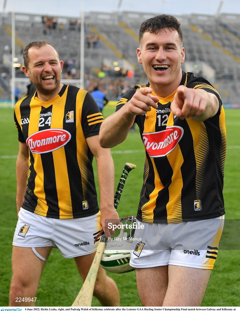 4 June 2022; Richie Leahy, right, and Padraig Walsh of Kilkenny celebrate after the Leinster GAA Hurling Senior Championship Final match between Galway and Kilkenny at Croke Park in Dublin. Photo by Ray McManus/Sportsfile