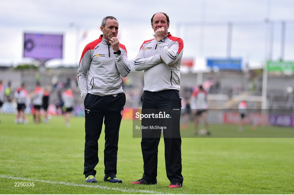 5 June 2022; Tyrone joint-managers Brian Dooher, left, and Feargal Logan before the GAA Football All-Ireland Senior Championship Round 1 match between Armagh and Tyrone at Athletic Grounds in Armagh. Photo by Ben McShane/Sportsfile