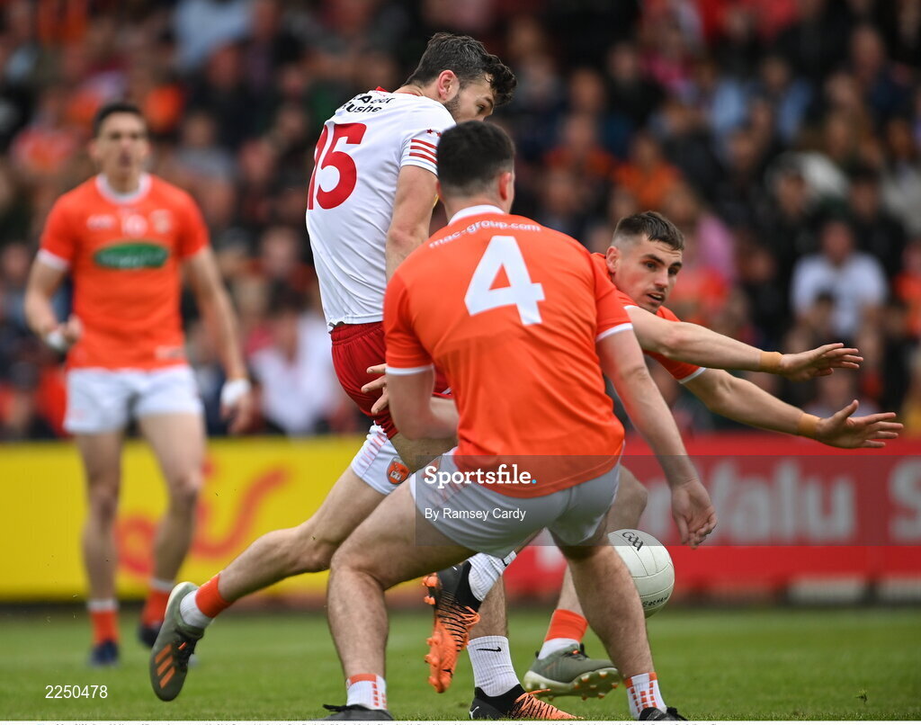 5 June 2022; Conor McKenna of Tyrone shoots to score his side's first goal during the GAA Football All-Ireland Senior Championship Round 1 match between Armagh and Tyrone at Athletic Grounds in Armagh. Photo by Ramsey Cardy/Sportsfile