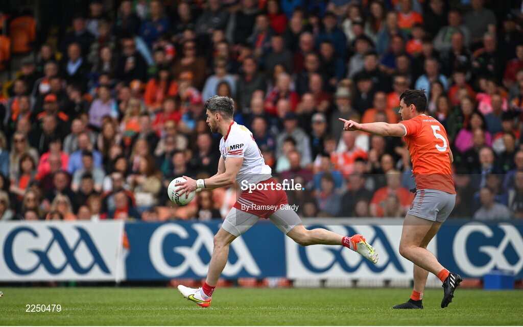 5 June 2022; Matthew Donnelly of Tyrone in action against Aaron McKay of Armagh during the GAA Football All-Ireland Senior Championship Round 1 match between Armagh and Tyrone at Athletic Grounds in Armagh. Photo by Ramsey Cardy/Sportsfile