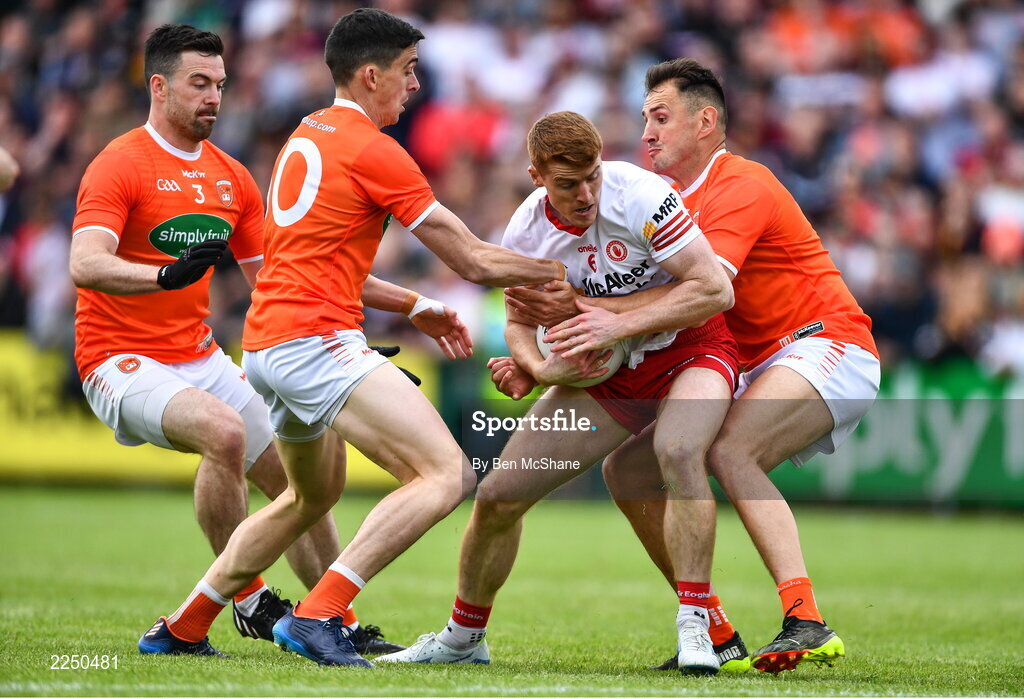 5 June 2022; Peter Harte of Tyrone in action against Armagh players, from left, Aidan Forker, Rory Grugan and Stephen Sheridan during the GAA Football All-Ireland Senior Championship Round 1 match between Armagh and Tyrone at Athletic Grounds in Armagh. Photo by Ben McShane/Sportsfile