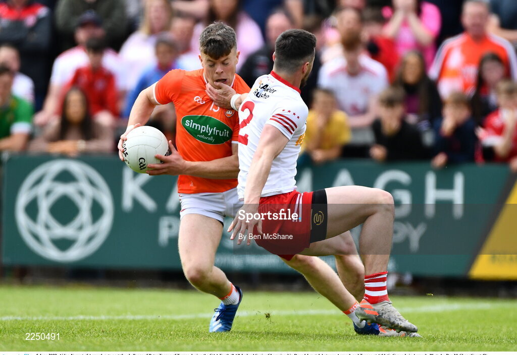 5 June 2022; Aidan Nugent of Armagh gets past the challenge of Peter Teague of Tyrone during the GAA Football All-Ireland Senior Championship Round 1 match between Armagh and Tyrone at Athletic Grounds in Armagh. Photo by Ben McShane/Sportsfile