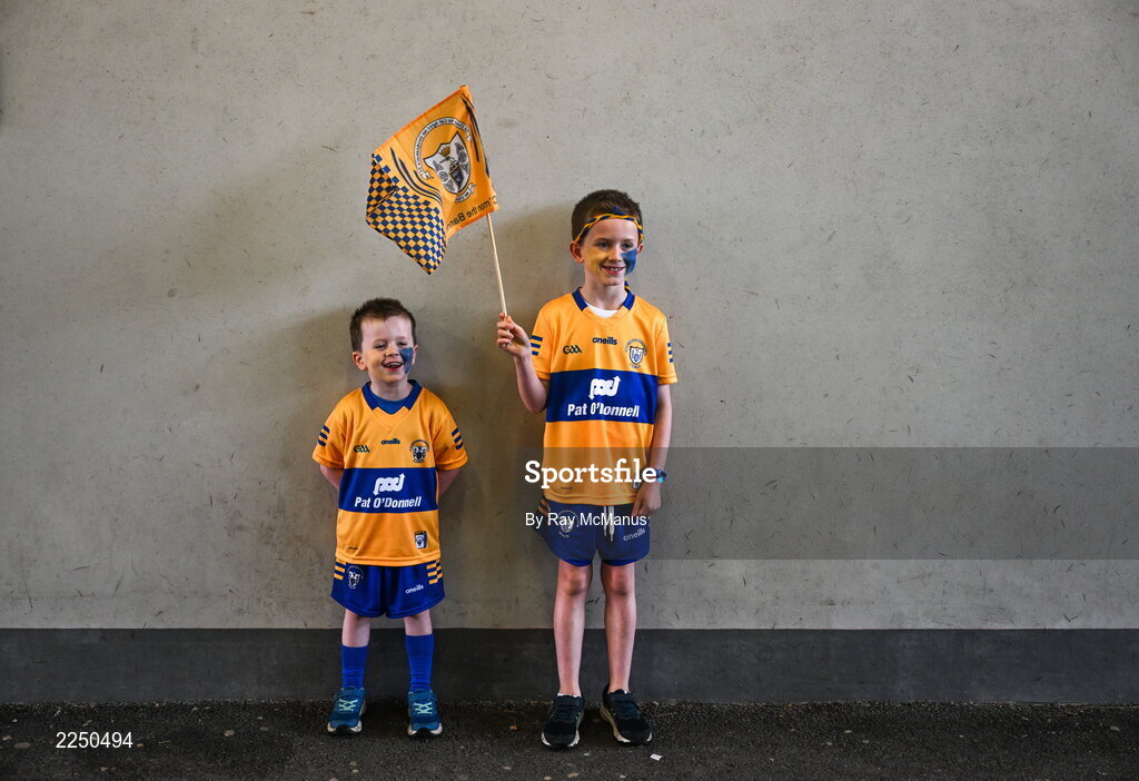 5 June 2022; Rowan, four years, and his brother Harrison Dwane, 7, from Lissycasey in Clare, before the Munster GAA Hurling Senior Championship Final match between Limerick and Clare at Semple Stadium in Thurles, Tipperary. Photo by Ray McManus/Sportsfile