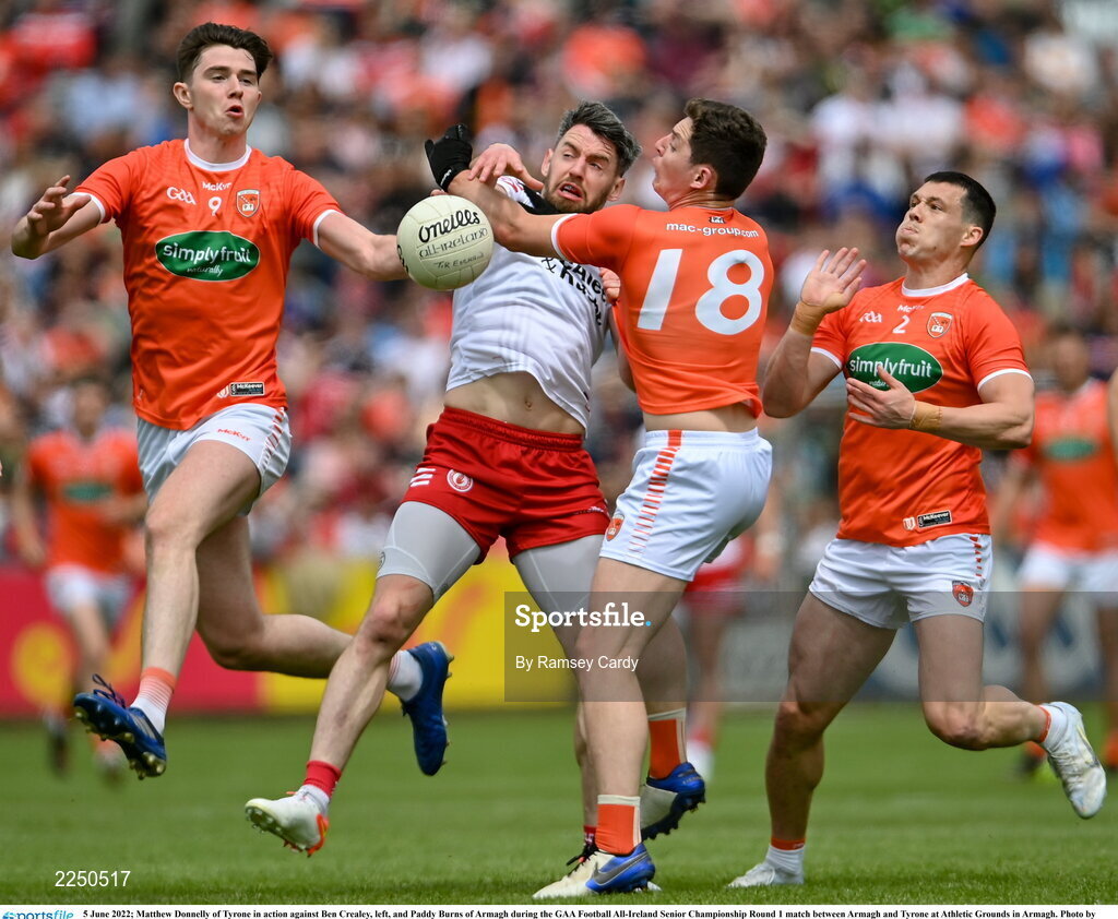 5 June 2022; Matthew Donnelly of Tyrone in action against Ben Crealey, left, and Paddy Burns of Armagh during the GAA Football All-Ireland Senior Championship Round 1 match between Armagh and Tyrone at Athletic Grounds in Armagh. Photo by Ramsey Cardy/Sportsfile