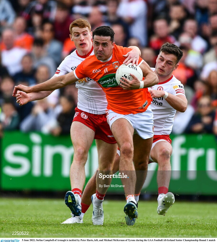 5 June 2022; Stefan Campbell of Armagh is tackled by Peter Harte, left, and Michael McKernan of Tyrone during the GAA Football All-Ireland Senior Championship Round 1 match between Armagh and Tyrone at Athletic Grounds in Armagh. Photo by Ben McShane/Sportsfile