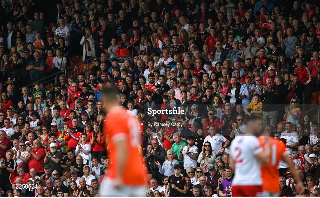 5 June 2022; Supporters stand for a minutes appluase, in the 27th minute, in memory of Michaela McAreavey during the GAA Football All-Ireland Senior Championship Round 1 match between Armagh and Tyrone at Athletic Grounds in Armagh. Photo by Ramsey Cardy/Sportsfile