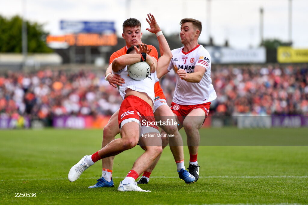 5 June 2022; Michael McKernan of Tyrone is tackled by Aidan Nugent of Armagh during the GAA Football All-Ireland Senior Championship Round 1 match between Armagh and Tyrone at Athletic Grounds in Armagh. Photo by Ben McShane/Sportsfile