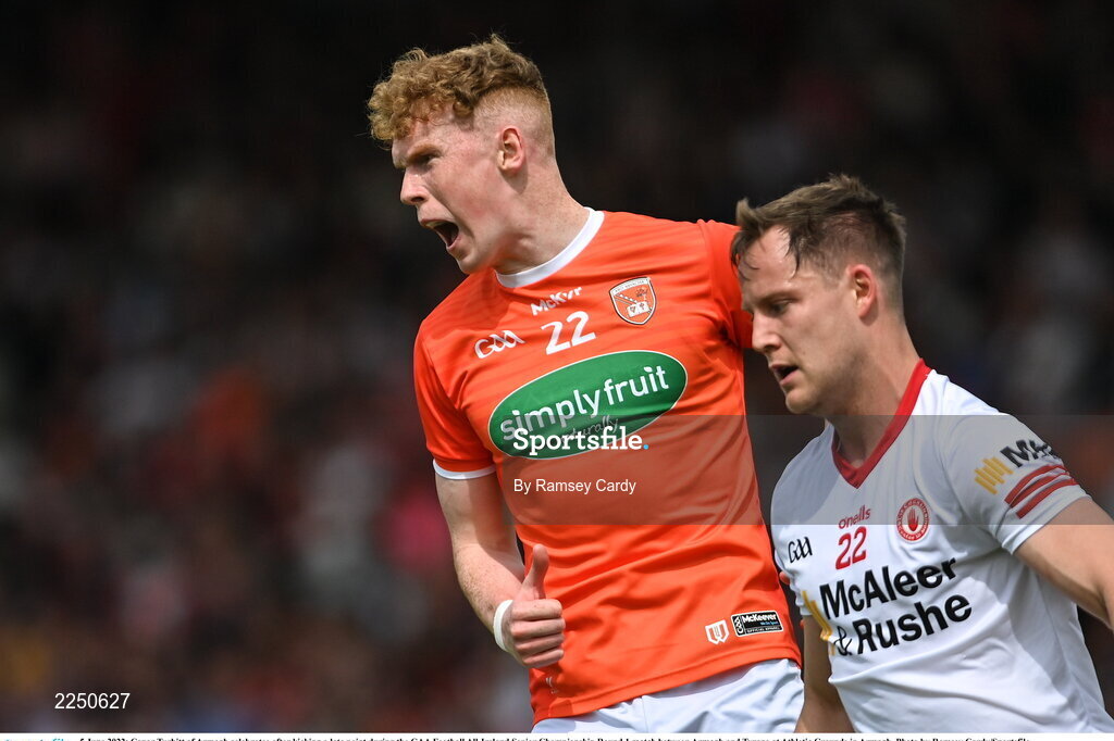 5 June 2022; Conor Turbitt of Armagh celebrates after kicking a late point during the GAA Football All-Ireland Senior Championship Round 1 match between Armagh and Tyrone at Athletic Grounds in Armagh. Photo by Ramsey Cardy/Sportsfile