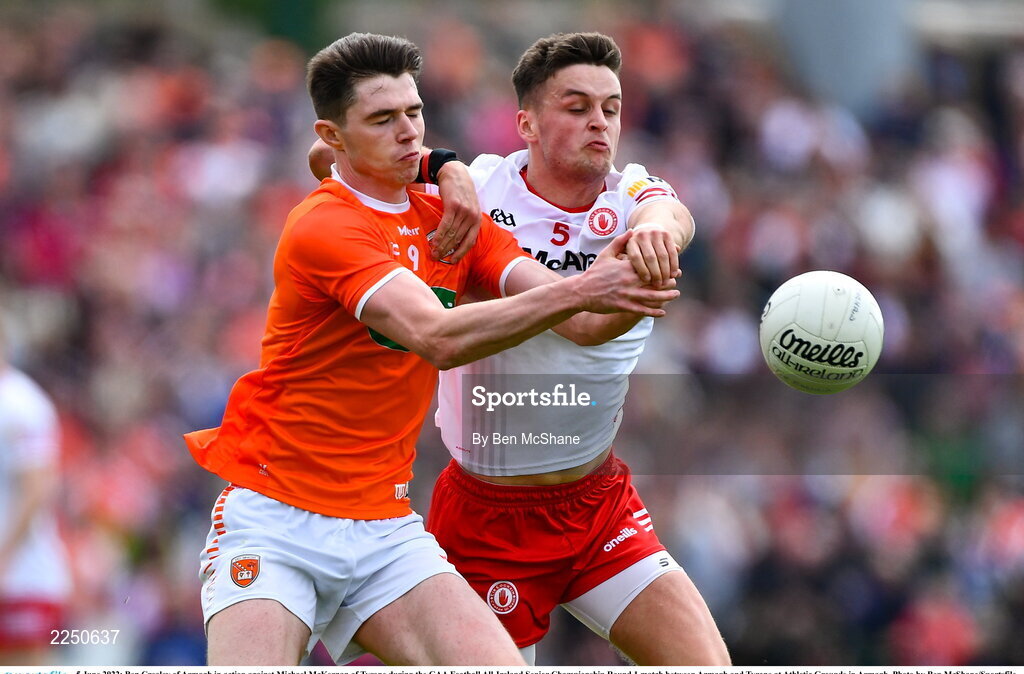 5 June 2022; Ben Crealey of Armagh in action against Michael McKernan of Tyrone during the GAA Football All-Ireland Senior Championship Round 1 match between Armagh and Tyrone at Athletic Grounds in Armagh. Photo by Ben McShane/Sportsfile