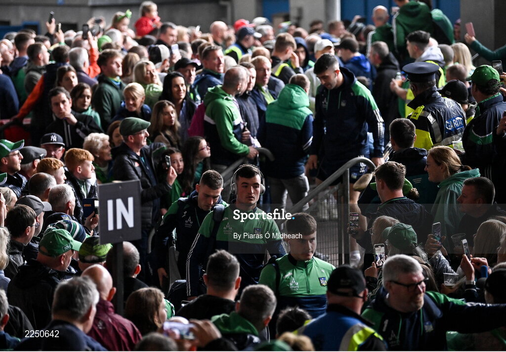 5 June 2022; Kyle Hayes of Limerick, centre, arrives for the Munster GAA Hurling Senior Championship Final match between Limerick and Clare at FBD Semple Stadium in Thurles, Tipperary. Photo by Piaras Ó Mídheach/Sportsfile