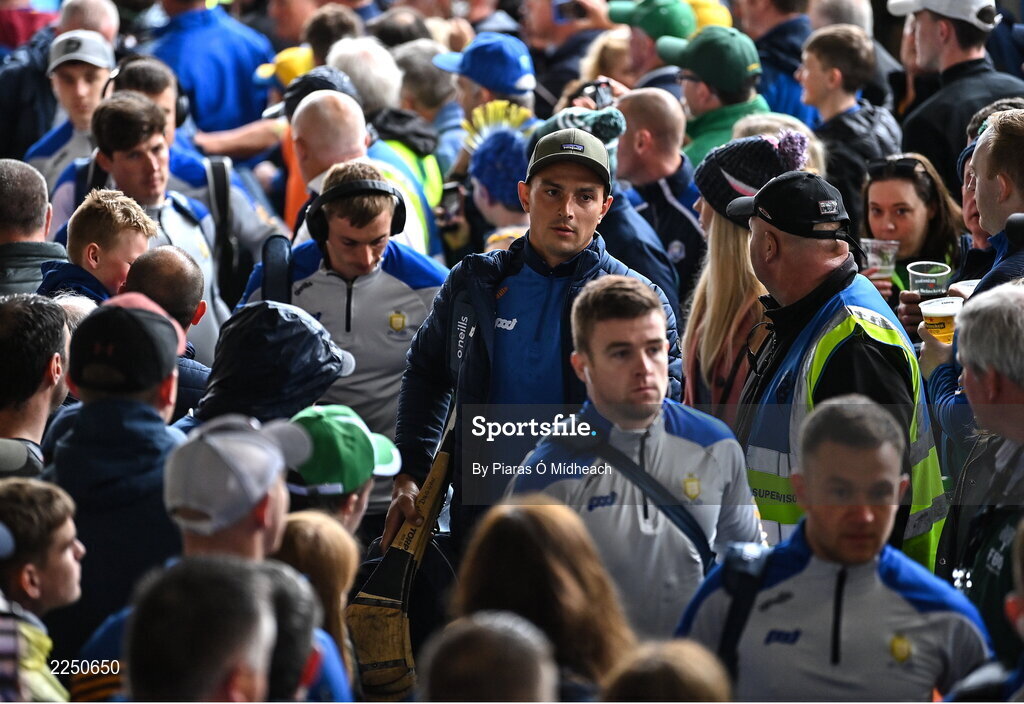 5 June 2022; Peter Duggan of Clare, centre, arrives for the Munster GAA Hurling Senior Championship Final match between Limerick and Clare at FBD Semple Stadium in Thurles, Tipperary. Photo by Piaras Ó Mídheach/Sportsfile