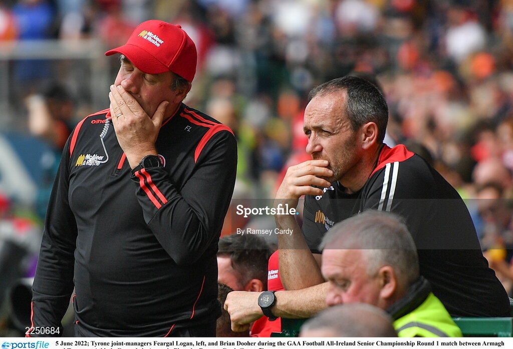 5 June 2022; Tyrone joint-managers Feargal Logan, left, and Brian Dooher during the GAA Football All-Ireland Senior Championship Round 1 match between Armagh and Tyrone at Athletic Grounds in Armagh. Photo by Ramsey Cardy/Sportsfile