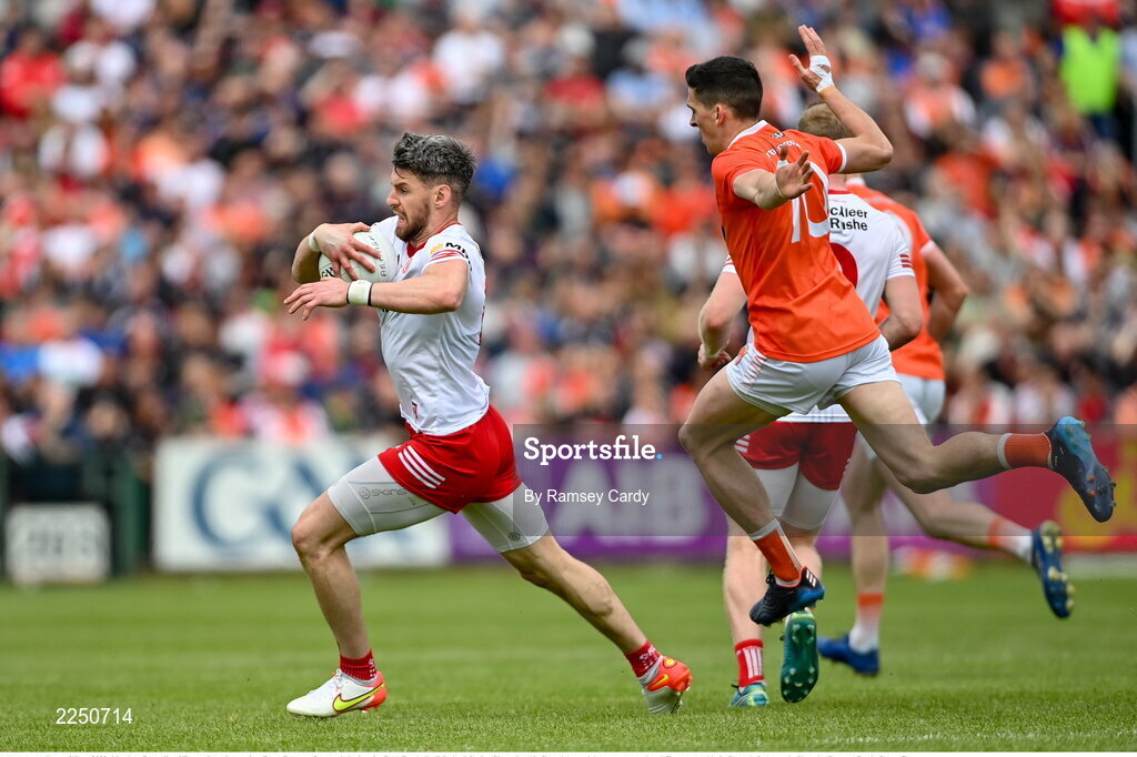 5 June 2022; Matthew Donnelly of Tyrone in action against Rory Grugan of Armagh during the GAA Football All-Ireland Senior Championship Round 1 match between Armagh and Tyrone at Athletic Grounds in Armagh. Photo by Ramsey Cardy/Sportsfile