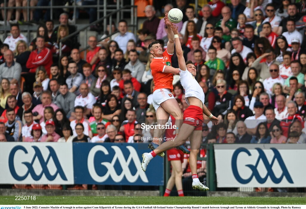 5 June 2022; Connaire Mackin of Armagh in action against Conn Kilpatrick of Tyrone during the GAA Football All-Ireland Senior Championship Round 1 match between Armagh and Tyrone at Athletic Grounds in Armagh. Photo by Ramsey Cardy/Sportsfile