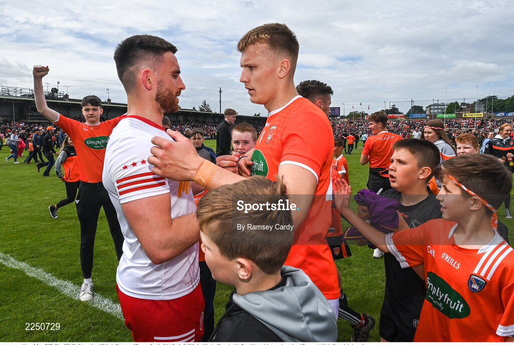 5 June 2022; Rian O'Neill of Armagh and Pádraig Hampsey of Tyrone after the GAA Football All-Ireland Senior Championship Round 1 match between Armagh and Tyrone at Athletic Grounds in Armagh.