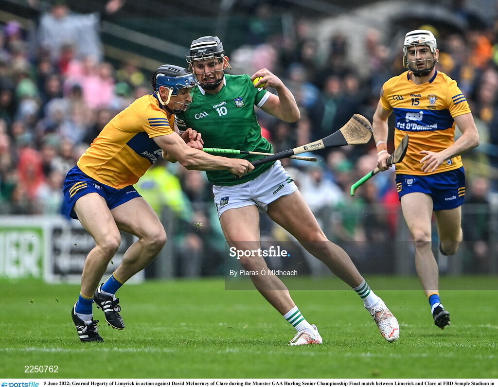 5 June 2022; Gearoid Hegarty of Limerick in action against David McInerney of Clare during the Munster GAA Hurling Senior Championship Final match between Limerick and Clare at FBD Semple Stadium in Thurles, Tipperary. Photo by Piaras Ó Mídheach/Sportsfile