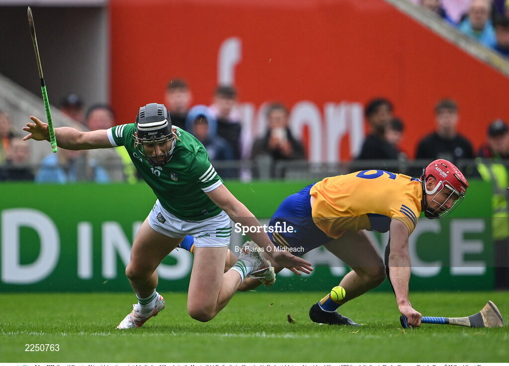 5 June 2022; Gearoid Hegarty of Limerick in action against John Conlon of Clare during the Munster GAA Hurling Senior Championship Final match between Limerick and Clare at FBD Semple Stadium in Thurles, Tipperary. Photo by Piaras Ó Mídheach/Sportsfile