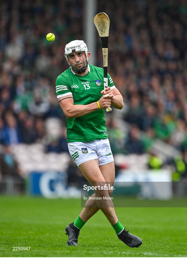5 June 2022; Aaron Gillane of Limerick takes a free during the Munster GAA Hurling Senior Championship Final match between Limerick and Clare at FBD Semple Stadium in Thurles, Tipperary. Photo by Brendan Moran/Sportsfile