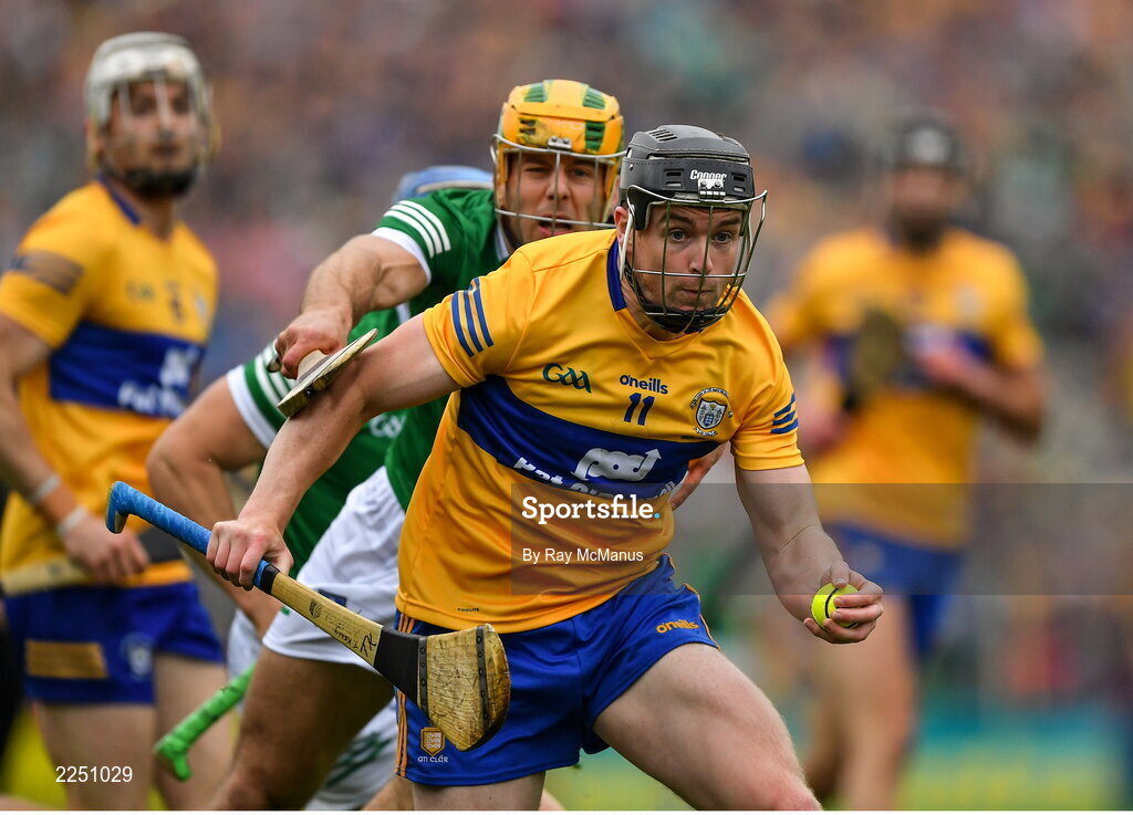 5 June 2022; Tony Kelly of Clare is tackled by Dan Morrisey of Limerick during the Munster GAA Hurling Senior Championship Final match between Limerick and Clare at Semple Stadium in Thurles, Tipperary. Photo by Ray McManus/Sportsfile