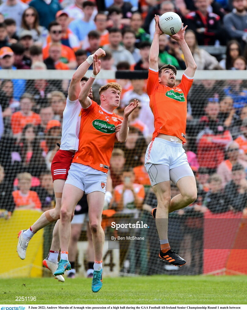 5 June 2022; Andrew Murnin of Armagh wins possession of a high ball during the GAA Football All-Ireland Senior Championship Round 1 match between Armagh and Tyrone at Athletic Grounds in Armagh. Photo by Ben McShane/Sportsfile
