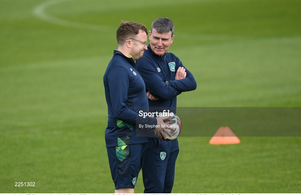 6 June 2022; Manager Stephen Kenny and Andrew Morrissey, STATSports analyst, left, during a Republic of Ireland training session at the FAI National Training Centre in Abbotstown, Dublin. Photo by Stephen McCarthy/Sportsfile