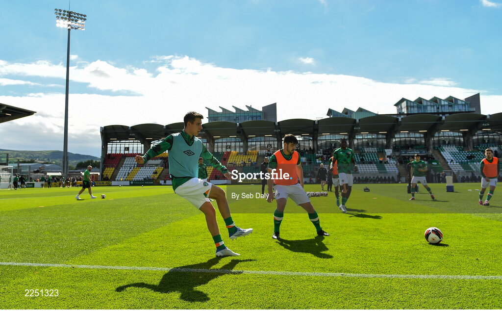 6 June 2022; Conor Noss, left, and Eiran Cashin of Republic of Ireland during the warm-up before the UEFA European U21 Championship qualifying group F match between Republic of Ireland and Montenegro at Tallaght Stadium in Dublin. Photo by Seb Daly/Sportsfile
