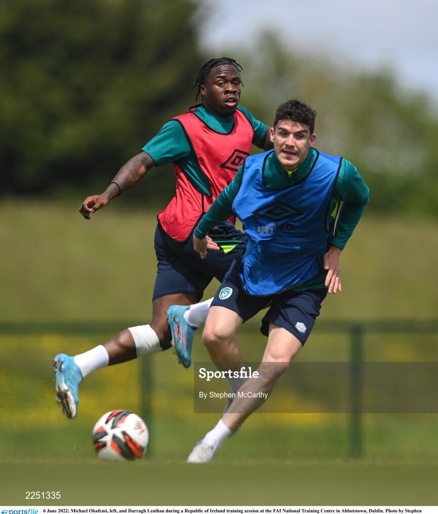 6 June 2022; Michael Obafemi, left, and Darragh Lenihan during a Republic of Ireland training session at the FAI National Training Centre in Abbotstown, Dublin. Photo by Stephen McCarthy/Sportsfile