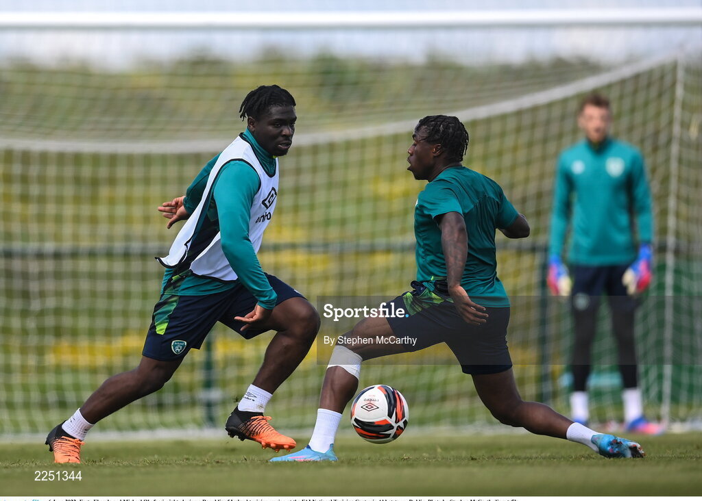 6 June 2022; Festy Ebosele and Michael Obafemi, right, during a Republic of Ireland training session at the FAI National Training Centre in Abbotstown, Dublin. Photo by Stephen McCarthy/Sportsfile