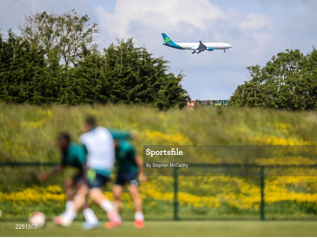 6 June 2022; An Aer Lingus plane at nearby Dublin Airport during a Republic of Ireland training session at the FAI National Training Centre in Abbotstown, Dublin. Photo by Stephen McCarthy/Sportsfile