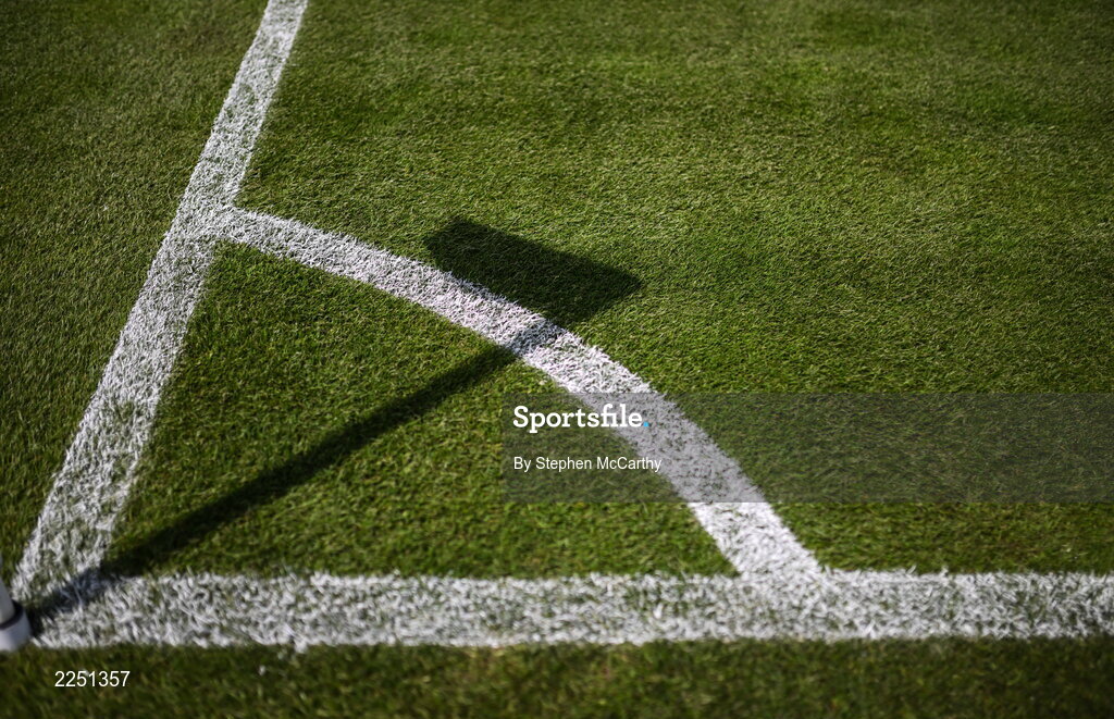 6 June 2022; The shadow of a corner flag is cast by the sun onto a marked pitch during a Republic of Ireland training session at the FAI National Training Centre in Abbotstown, Dublin. Photo by Stephen McCarthy/Sportsfile