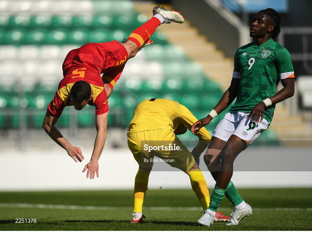 6 June 2022; Anto Babic of Montenegro after a coming together with Montenegro goalkeeper Nikola Ivezic during the UEFA European U21 Championship qualifying group F match between Republic of Ireland and Montenegro at Tallaght Stadium in Dublin. Photo by Eóin Noonan/Sportsfile