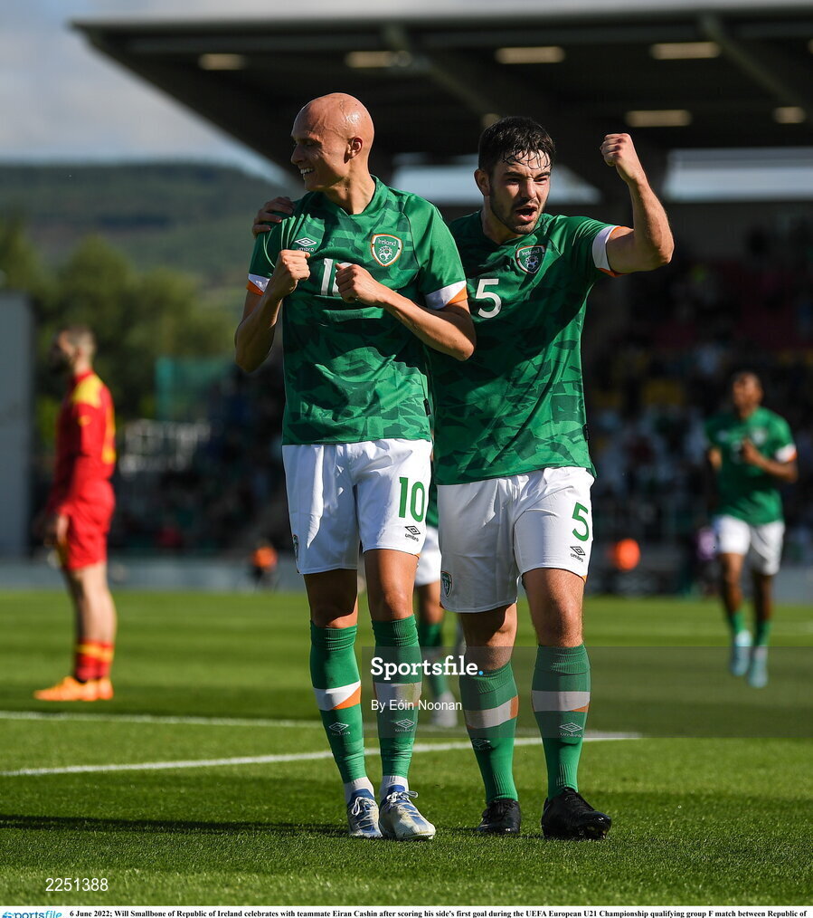 6 June 2022; Will Smallbone of Republic of Ireland celebrates with teammate Eiran Cashin after scoring his side's first goal during the UEFA European U21 Championship qualifying group F match between Republic of Ireland and Montenegro at Tallaght Stadium in Dublin. Photo by Eóin Noonan/Sportsfile
