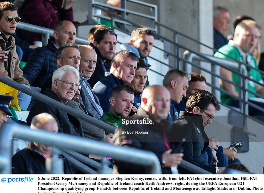 6 June 2022; Republic of Ireland manager Stephen Kenny, centre, with, from left, FAI chief executive Jonathan Hill, FAI President Gerry McAnaney and Republic of Ireland coach Keith Andrews, right, during the UEFA European U21 Championship qualifying group F match between Republic of Ireland and Montenegro at Tallaght Stadium in Dublin. Photo by Eóin Noonan/Sportsfile