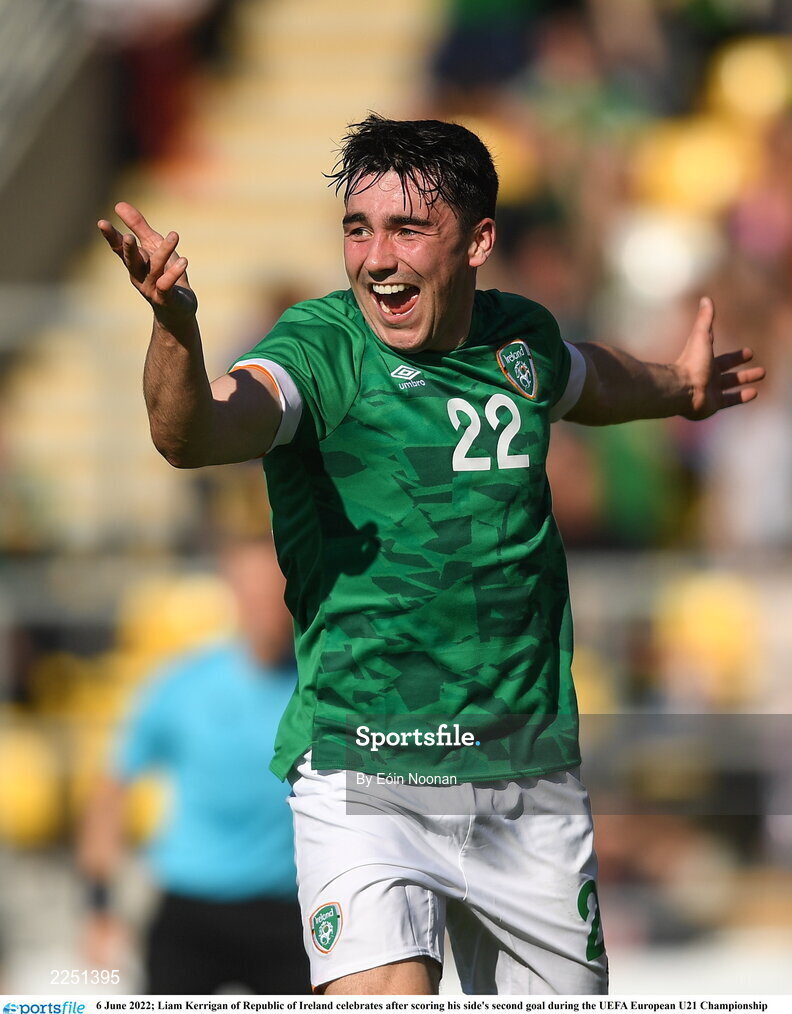 6 June 2022; Liam Kerrigan of Republic of Ireland celebrates after scoring his side's second goal during the UEFA European U21 Championship qualifying group F match between Republic of Ireland and Montenegro at Tallaght Stadium in Dublin. Photo by Eóin Noonan/Sportsfile
