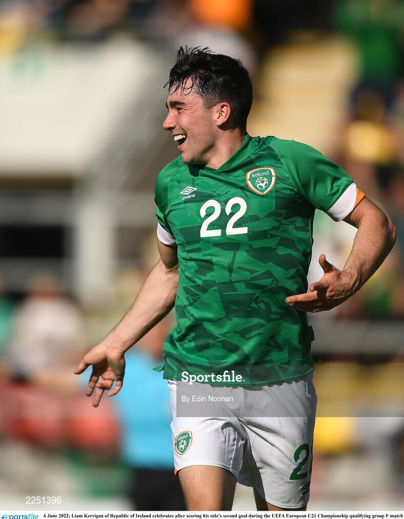 6 June 2022; Liam Kerrigan of Republic of Ireland celebrates after scoring his side's second goal during the UEFA European U21 Championship qualifying group F match between Republic of Ireland and Montenegro at Tallaght Stadium in Dublin. Photo by Eóin Noonan/Sportsfile