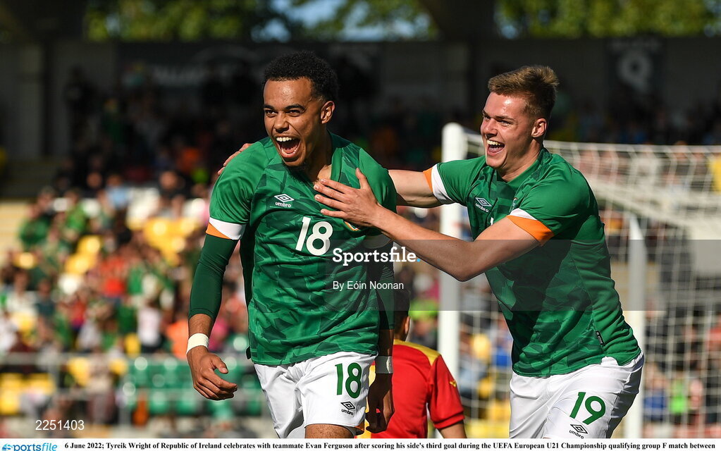 6 June 2022; Tyreik Wright of Republic of Ireland celebrates with teammate Evan Ferguson after scoring his side's third goal during the UEFA European U21 Championship qualifying group F match between Republic of Ireland and Montenegro at Tallaght Stadium in Dublin. Photo by Eóin Noonan/Sportsfile