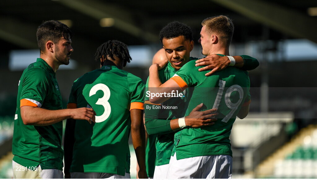 6 June 2022; Tyreik Wright of Republic of Ireland celebrates with teammate Evan Ferguson after scoring his side's third goal during the UEFA European U21 Championship qualifying group F match between Republic of Ireland and Montenegro at Tallaght Stadium in Dublin. Photo by Eóin Noonan/Sportsfile