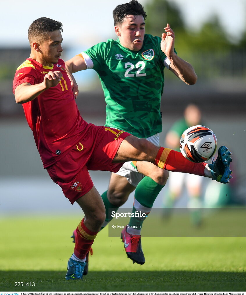 6 June 2022; Ðorde Šaletic of Montenegro in action against Liam Kerrigan of Republic of Ireland during the UEFA European U21 Championship qualifying group F match between Republic of Ireland and Montenegro at Tallaght Stadium in Dublin. Photo by Eóin Noonan/Sportsfile