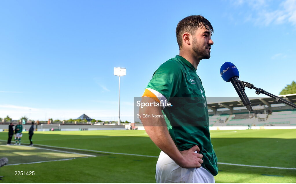 6 June 2022; Eiran Cashin of Republic of Ireland speaking to RTÉ after the UEFA European U21 Championship qualifying group F match between Republic of Ireland and Montenegro at Tallaght Stadium in Dublin. Photo by Eóin Noonan/Sportsfile