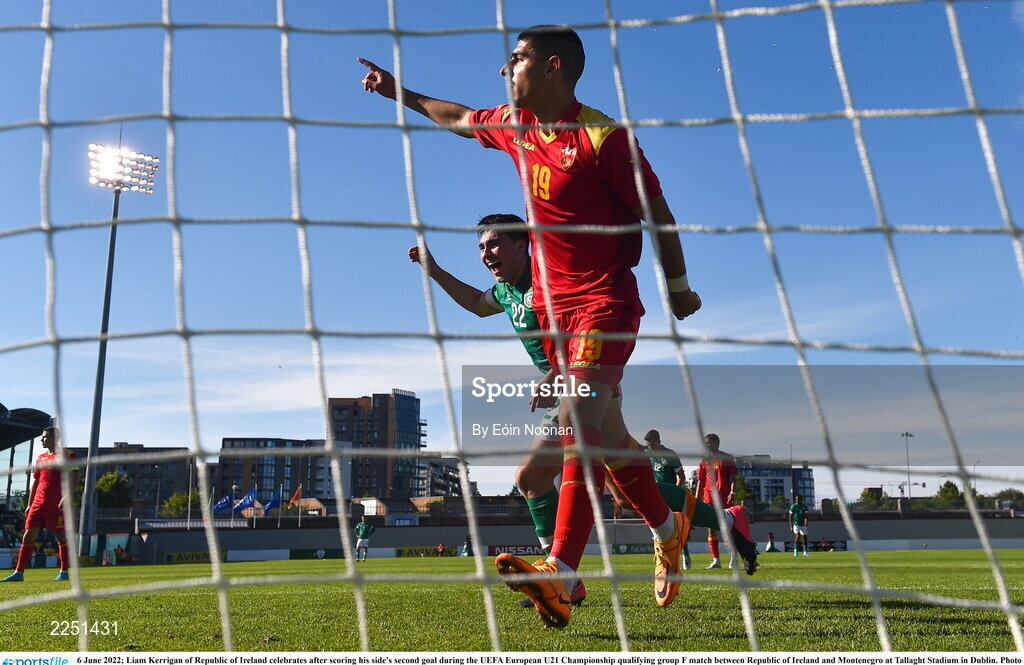 6 June 2022; Liam Kerrigan of Republic of Ireland celebrates after scoring his side's second goal during the UEFA European U21 Championship qualifying group F match between Republic of Ireland and Montenegro at Tallaght Stadium in Dublin. Photo by Eóin Noonan/Sportsfile
