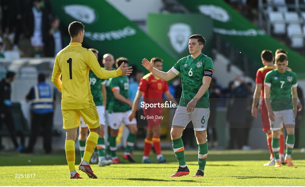 6 June 2022; Conor Coventry of Republic of Ireland and Montenegro goalkeeper Nikola Ivezic after the UEFA European U21 Championship qualifying group F match between Republic of Ireland and Montenegro at Tallaght Stadium in Dublin. Photo by Seb Daly/Sportsfile