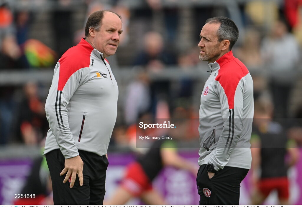 5 June 2022; Tyrone joint-managers Feargal Logan, left, and Brian Dooher before the GAA Football All-Ireland Senior Championship Round 1 match between Armagh and Tyrone at Athletic Grounds in Armagh. Photo by Ramsey Cardy/Sportsfile