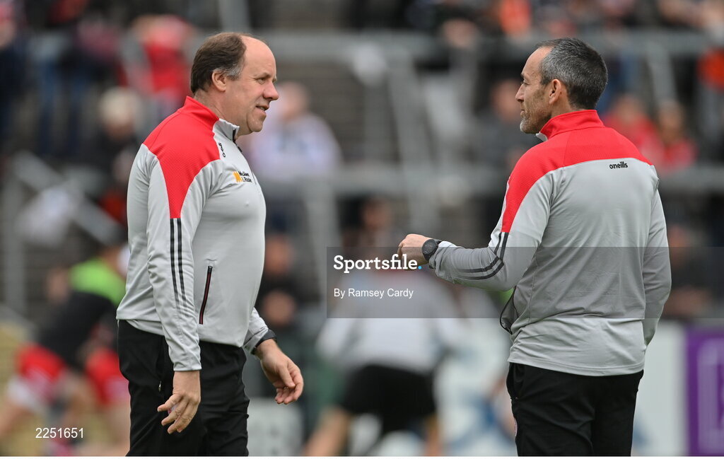 5 June 2022; Tyrone joint-managers Feargal Logan, left, and Brian Dooher before the GAA Football All-Ireland Senior Championship Round 1 match between Armagh and Tyrone at Athletic Grounds in Armagh. Photo by Ramsey Cardy/Sportsfile