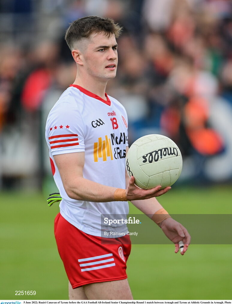 5 June 2022; Ruairí Canavan of Tyrone before the GAA Football All-Ireland Senior Championship Round 1 match between Armagh and Tyrone at Athletic Grounds in Armagh. Photo by Ramsey Cardy/Sportsfile
