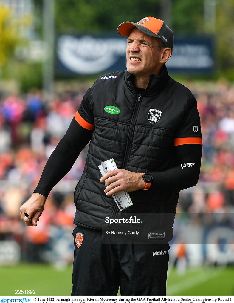 5 June 2022; Armagh manager Kieran McGeeney during the GAA Football All-Ireland Senior Championship Round 1 match between Armagh and Tyrone at Athletic Grounds in Armagh. Photo by Ramsey Cardy/Sportsfile