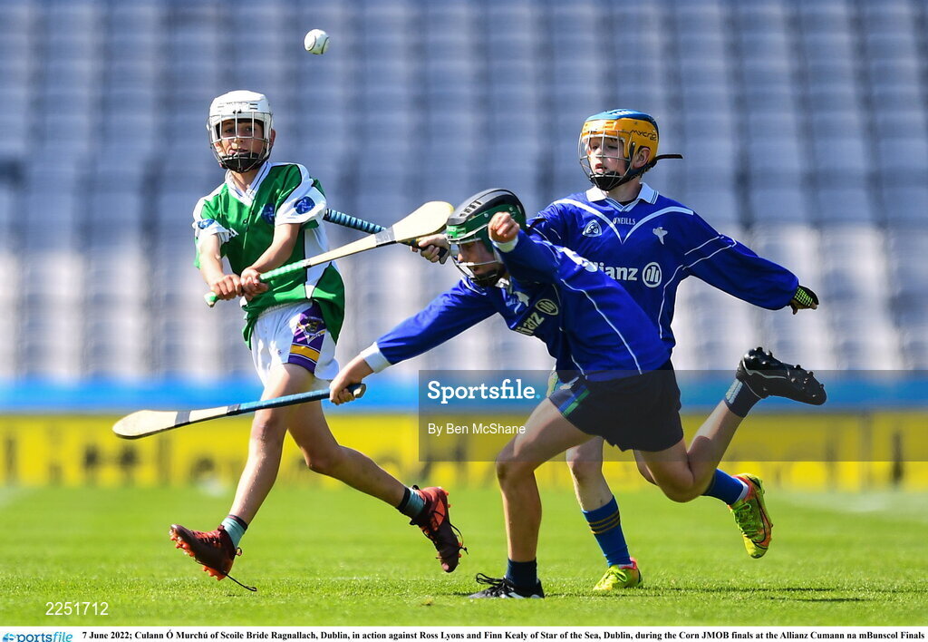 7 June 2022; Culann Ó Murchú of Scoile Bride Ragnallach, Dublin, in action against Ross Lyons and Finn Kealy of Star of the Sea, Dublin, during the Corn JMOB final at the Allianz Cumann na mBunscol Finals in Croke Park, Dublin. Photo by Ben McShane/Sportsfile