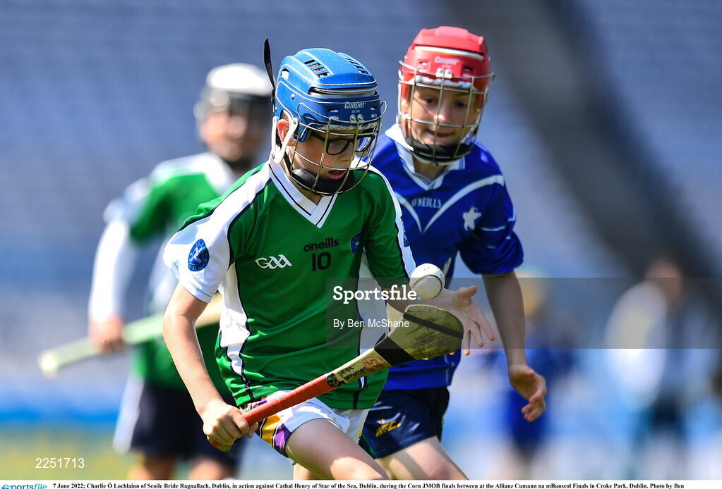 7 June 2022; Charlie Ó Lochlainn of Scoile Bride Ragnallach, Dublin, in action against Cathal Henry of Star of the Sea, Dublin, during the Corn JMOB final at the Allianz Cumann na mBunscol Finals in Croke Park, Dublin. Photo by Ben McShane/Sportsfile